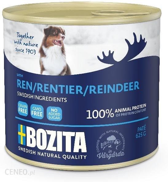 Nowy wygląd i jeszcze lepszy smak: soczysta karma mokra Bozita Pate jest już dostępna w nowych opakowaniach! Naturalna koncepcja i wysokowartościowe składniki nadal są najwyższej jakości i pochodzą ze szwedzkich gospodarstw, w których szanuje się zwierzęta i środowisko. Producent wykorzystuje jedynie naturalne składniki, których jakość podlega regularnym kontrolom. Ponieważ regulacje prawne dotyczące BHP i hodowli zwierząt są w Szwecji bardzo surowe, masz gwarancję, że Twój pies otrzyma bezpieczny i pyszny posiłek, bez antybiotyków i mączek. Bozita Pate to karma, która może być zarówno pełnowartościowym posiłkiem, jak i soczystym dodatkiem do karmy mokrej. Wyjątkowo wysoka zawartość świeżego mięsa jest doskonałym źródłem wartościowych białek zwierzęcych i pokrywa naturalne potrzeby żywieniowe psów. Zrezygnowano z dodatku zbóż, cukru, soi i wszelkich zbędnych dodatków. Dzięki temu jest ona odpowiednia dla psów wrażliwych na niektóre substancje oraz cierpiących na alergie. Dzięki wysokiej jakości surowców, karma wyróżnia się wysoką akceptacją ze strony psów, a ponadto zapewnia im wszystkie niezbędne witaminy i minerały, które gwarantują psu witalność i dobre samopoczucie. Bozita – naturalnie czysta karma ze Szwecji! Bozita Pate w skrócie: Zbilansowana karma podstawowa dla dorosłych psów Bezzbożowa: odpowiednia dla psów wrażliwych i cierpiących na alergie Naturalna, jeszcze lepsza receptura: bez soi, cukru i zbędnych dodatków, naturalne surowce ze szwedzkich gospodarstw Produkowana w Szwecji: regulacje prawne dotyczące BHP i hodowli zwierząt są w Szwecji bardzo surowe, więc masz gwarancję, że Twój pies otrzyma bezpieczny i pyszny posiłek, bez antybiotyków i mączek Wysoka zawartość mięsa: świeże mięso najwyższej jakości pokrywa zapotrzebowanie na białko oraz jest lekkostrawne Różnorodność wariantów: do wyboru sześć atrakcyjnych smaków karmy Bozita Całościowe pokrycie zapotrzebowania na substancje witalne: karma bogata w witaminy i minerały, może być podawana jako jedyny posiłek oraz jako dodatek do karm suchych Wysoka akceptacja: dzięki świeżym, aromatycznym składnikom Pakiet mieszany składa się z następujących smaków: 4 x 625 g Wołowina 4 x 625 g Renifer 4 x 625 g Indyk