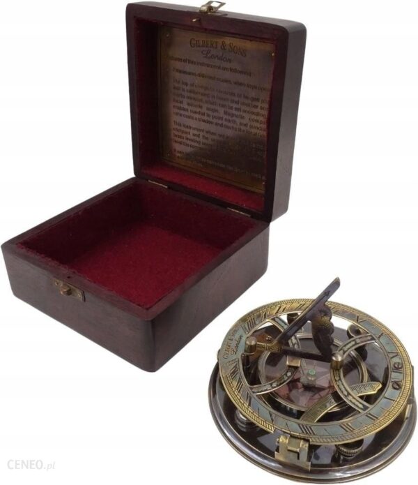 Ekskluzywny KOMPAS z Zegarem Słonecznym PREZENTEkskluzywny Kompas z Zegarem Słonecznym GilbertKompas na prezent w eleganckim pudełku drewnianym będzie służył zarówno w terenie, jak i w domowym zaciszu jako gustowna dekoracja.Specyfikacja:Wymiary: śr. 12cmMateriał: mosiądzKolory: mosiężny, brązowyCyfry rzymskiePudełko:Materiał: drewnoWymiary: 14,5 x 14,5 x 6,5cmWieko od wewnątrz: mosiężna tabliczka z instrukcją użytkowania w j. angielskimZegar słoneczny z kompasem sprawdzi się jako:Elegancki prezent dla podróżnikaPrezent dla tatyEkskluzywny prezent na ważne okazjeGustowna dekoracja biurkaPrezent dla prezesaGustowna i niesamowicie Piękna Dekoracja do Każdego Domu!Idealna i Pełna Wdzięku, by uczynić Twój Dom Czarującym, Olśniewającym oraz HarmonijnymWspaniała do Użytku WłasnegoDoskonała jako WYJĄTKOWY PREZENT dla WYJĄTKOWEJ OSOBY!G_DSUN-0002