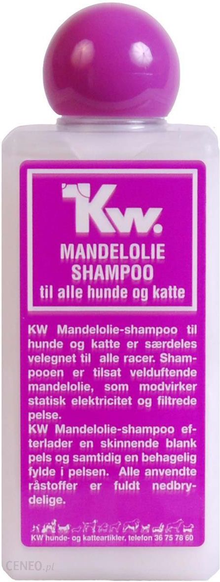 Szampon KW z olejkiem migdałowym 200ml Szampon z olejkiem migdałowym Kw jest odpowiedni do wszystkich rodzajów włosów .Do szamponu jest dodany olej migdałowy,który działa przeciwko elektryczności statycznej i filcowania włosów . Szampon zapewnia połysk, a także przyjemny puszysty włos – zwiększa objętość . Szampon jest bardzo delikatny,włosy są dokładnie oczyszczone bez podrażniania skóry. Sposób użytkowania: Rozcieńczyć szampon w stosunku 1:3 (1 część szamponu do 3 części wody) i wymieszać. Nanieść szampon na mokrą sierść. Dokładnie wmasować i pozostawić szampon na jedną minutę. Obficie spłukać letnią wodą. Jeśli pies jest bardzo brudny można powtórzyć czynność. Unikać kontaktu z oczami.